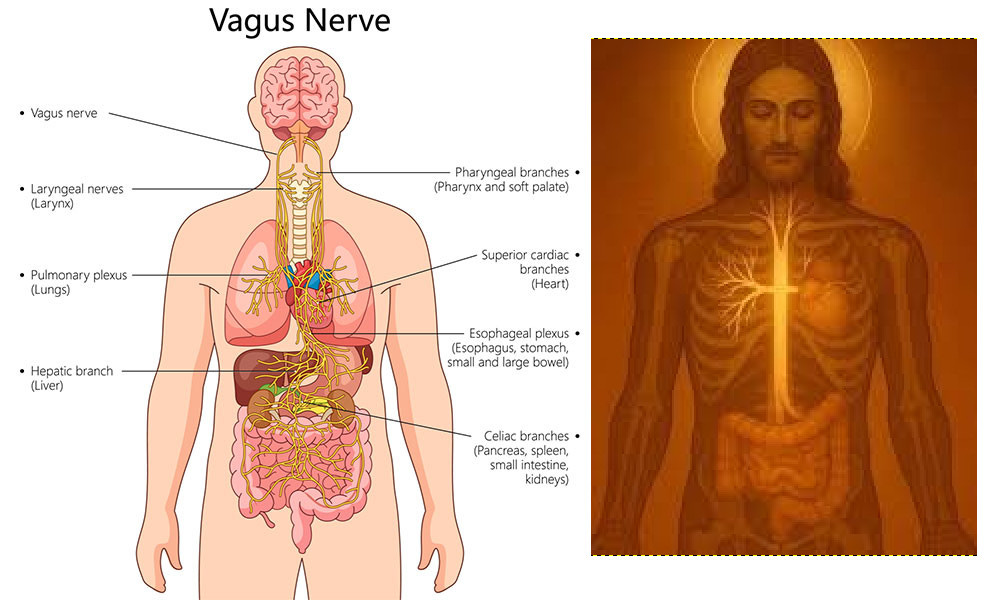 The vagus nerve does not resemble a cross. Anatomically, it is branching and tree-like, spreading through the chest and abdomen. The cross comparison exists only because Christians already regard the cross as sacred. It is more like projection, and not perception.